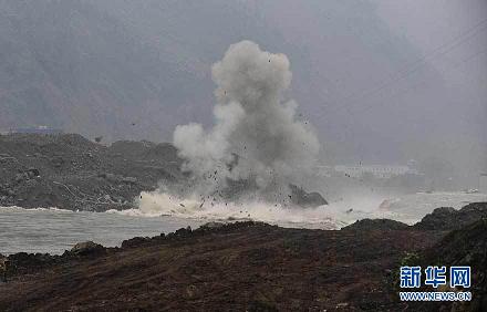 8月17日,第二次對(duì)巨石的爆破成功進(jìn)行。當(dāng)日,四川汶川縣映秀鎮(zhèn)對(duì)岷江紅椿溝段壅塞體進(jìn)行了兩次爆破,使泄洪渠得到有效拓寬。據(jù)爆破現(xiàn)場(chǎng)負(fù)責(zé)人介紹,爆破主要是為消除8塊巨石,這些巨石超出了挖掘機(jī)的負(fù)荷量,必須選擇爆破方式解決。